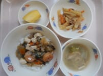 本日の給食は・・・ *にんじんごはん 〈米・にんじん・白だし・コンソメ・バター〉 *トマトの煮込みハンバーグ 〈豚ひき肉・牛ひき肉・玉ねぎ・塩・パン粉・牛乳・ケチャップ・中濃ソース・みりん・酒・にんにく・ホールトマト缶・バター・コンソメ〉 *野菜のオーブン焼き 〈赤ピーマン・かぼちゃ・ブロッコリー・塩・ガーリックパウダー・オリーブ油〉 *白菜とコーンのスープ 〈白菜・コーン・しめじ・コンソメ・塩〉 *フルーツポンチ 〈パイン缶・みかん缶・いちご・みかん缶液汁〉 本日のおやつは・・・ ◆牛乳 ◆じゃこチップ ...