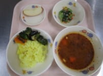 本日の給食は… *食パン *かれいのムニエル <かれい・塩・こしょう・小麦粉・バター> *ポテトサラダ <じゃがいも・人参・ハム・きゅうり・マヨドレ・塩・砂糖> *野菜チャウダー <玉ねぎ・人参・キャベツ・ブロッコリー・バター・小麦粉・コンソメ・塩・こしょう・水・豆乳・粉チーズ> *パイン缶 本日のおやつは… ◆牛乳 ◆そばめし <やきそばめん・米・キャベツ・人参・小松菜・油・中濃ソース・お好み焼きソース・ケチャップ・砂糖・あおのり・天かす> 本日のごっくん期の離乳食は… 〇パン粥 〇かれい・ブロッコリー ...