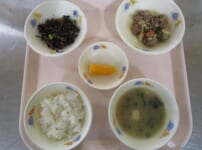 本日の給食は… *ごはん *ジンギスカン <ラム肉・キャベツ・もやし・玉ねぎ・人参・ピーマン・しょうゆ・酒・みりん・おろしにんにく・おろししょうが・りんご・玉ねぎ・りんごジャム・砂糖> *ひじきの炒め煮 <ひじき・人参・さつま揚げ・枝豆・油・砂糖・しょうゆ・酒・みりん> *みそ汁(木綿豆腐・ほうれん草・なめこ・ねぎ) *オレンジ 本日のおやつは… ◆牛乳 ◆みかん蒸しパン <小麦粉・ベーキングパウダー・砂糖・オレンジジュース・油・みかん缶> 本日のもぐもぐ期の離乳食は… 〇ひじき粥 <米・ひじき> 〇ほう ...