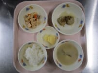 本日の給食は・・・ *ごはん *豆腐ハンバーグのおろしソース煮 <木綿豆腐・玉ねぎ・人参・鶏ひき肉・ごぼう・しょうが・片栗粉・塩・かつおだし・酒・みりん・しょうゆ・大根・万能ねぎ> *たけのこの炒め煮 <たけのこ・人参・豚肉・しょうゆ・みりん・ごま油・かつおだし> *みそ汁(白菜・さつまいも) *パイン缶 本日のおやつは・・・ ◆ビスケット ◆ババロア <オレンジジュース・生クリーム・牛乳・砂糖・ゼラチン> 本日のかみかみ期の離乳食は… ★軟飯 ★豆腐ハンバーグのおろしソースがけ <木綿豆腐・鶏ひき肉・人 ...