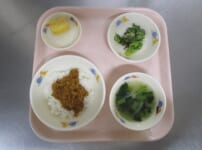 本日の給食は… *ごはん *炒り鶏 〈鶏もも肉・高野豆腐・干ししいたけ・玉ねぎ・ごぼう・人参・たけのこ・板こんにゃく・なると・さやえんどう・しょうゆ・みりん・酒・三温糖〉 *ほうれん草の納豆和え 〈ほうれん草・ひきわり納豆・人参・しょうゆ・三温糖・焼きのり〉 *みそ汁 〈油揚げ・大根・白みそ・煮干しだし汁〉 *パイン 本日のおやつは… ◆牛乳 ◆ボンボローニ 〈強力粉・三温糖・塩・ドライイースト・かぼちゃ・牛乳・バター・なたね油・生クリーム・グラニュー糖〉 本日のもぐもぐ期離乳食は… 〇粥 〇炒り鶏 〈鶏 ...