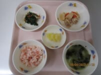 本日の給食は… *牛丼 〈米・牛もも・牛ばら・白菜・しらたき・たまねぎ・人参・ねぎ・おろししょうが・しょうゆ・酒・三温糖・みりん〉 *小松菜のガーリック炒め 〈小松菜・人参・しめじ・コーン・オリーブ油・にんにく・コンソメ・塩〉 *みそ汁 〈白みそ・煮干だし汁・ちくわ・あおさ・じゃがいも〉 *オレンジ 本日のおやつは… ◇牛乳 ◇照り焼きチキントースト 〈食パン・鶏もも肉・おろししょうが・しょうゆ・みりん・三温糖・マヨドレ・とろけるチーズ・焼きのり〉 本日のもぐもぐ期離乳食は… ◆軟飯 ◆牛肉の煮物 〈牛肉 ...