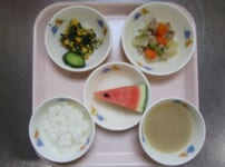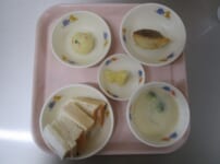 本日の給食は… *食パン *かれいのムニエル <かれい・塩・こしょう・小麦粉・バター> *ポテトサラダ <じゃがいも・人参・ハム・きゅうり・マヨドレ・塩・砂糖> *野菜チャウダー <玉ねぎ・人参・キャベツ・ブロッコリー・バター・小麦粉・コンソメ・塩・こしょう・水・豆乳・粉チーズ> *パイン缶 本日のおやつは… ◆牛乳 ◆そばめし <やきそばめん・米・キャベツ・人参・小松菜・油・中濃ソース・お好み焼きソース・ケチャップ・砂糖・あおのり・天かす> 本日のごっくん期の離乳食は… 〇パン粥 〇かれい・ブロッコリー ...