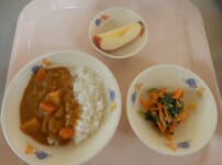 本日の給食は・・・ *ごはん *カレーライス 〈豚もも肉・玉ねぎ・にんじん・じゃがいも・バター・牛乳・スキムミルク・カレールウ・ケチャップ・中濃ソース〉 *小松菜とツナのサラダ 〈小松菜・にんじん・コーン・ツナ・オリーブ油・塩・しょうゆ・酢〉 *りんご 本日のおやつは・・・ ◆牛乳 ◆サンドウィッチ 〈食パン・ハム・きゅうり・マヨドレ・三温糖・塩〉