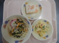 本日の給食は・・・ *あごだしうどん 〈うどん・あごだし汁・鶏もも肉・たまねぎ・にんじん・ねぎ・小松菜・油揚げ・かまぼこ・干し椎茸・白だし・みりん・酒・塩〉 *ポテトサラダ 〈じゃがいも・きゅうり・にんじん・ベーコン・コーン・マヨドレ・三温糖・塩〉 *みかん牛乳缶 〈牛乳・みかん缶・粉寒天・三温糖・バニラエッセンス〉 本日のおやつは・・・ ◆麦茶 ◆しらすと桜えびのおにぎり 〈米・しらす・ごま油・桜えび・ひじき・ほんだし・しょうゆ・三温糖〉
