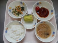 本日の給食は・・・ *ごはん *ハンバーグ 〈豚ひき肉・玉ねぎ・生姜・塩・パン粉・牛乳・ケチャップ・中濃ソース・みりん・ミニトマト〉 *ほうれん草の白和え 〈ほうれん草・キャベツ・にんじん・木綿豆腐・すりごま・しょうゆ・三温糖〉 *みそ汁 〈白みそ・煮干しだし汁・切干大根・しめじ・白菜〉 *バナナ 本日のおやつは・・・ ◆牛乳 ◆りんごゼリー 〈りんごジュース・三温糖・アガー〉