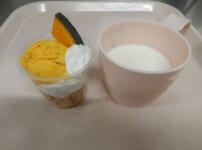 本日のおやつは… 〇牛乳 〇かぼちゃパフェ 〈南瓜・生クリーム・三温糖・バニラエッセンス・コーンフレーク〉
