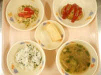 本日の給食は… *わかめご飯 〈米・炊き込みご飯〉 *豆腐の小判揚げ 〈木綿豆腐・鶏ひき肉・人参・ねぎ・玉ねぎ・ひじき・塩・おろししょうが・片栗粉・パン粉・油・ケチャップ〉 *棒棒鶏 〈鶏ささみ・きゅうり・もやし・ミニトマト・しょうゆ・酢・三温糖・すりごま・ねりごま・ごま油〉 *中華風とろみスープ 〈クリームコーン缶・干し椎茸・ねぎ・チンゲン菜・中華だしの素・しょうゆ・ごま油・片栗粉〉 *バナナ 本日のおやつは… ◆牛乳 ◆南瓜コロッケ 〈かぼちゃ・玉ねぎ・豚ひき肉・しょうゆ・みりん・三温糖・酒・小麦粉・ ...