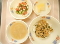 本日の給食は… *冷やしそうめん 〈干しそうめん・油・ツナ水煮・油揚げ・人参・きゅうり・干し椎茸・しょうゆ・中華だしの素・酢・ごま油・ごま〉 *ブロッコリーのナムル 〈ブロッコリー・ミニトマト・しょうゆ・中華だしの素・酢・ごま油・ごま〉 *豚汁 〈豚バラ・豚もも・大根・人参・玉ねぎ・ごぼう・じゃがいも・ねぎ・木綿豆腐・つきこんにゃく・かつお昆布だし汁・白みそ・ごま油・しょうゆ〉 *バナナ 本日のおやつは… ◆牛乳 ◆じゃがたこ 〈じゃがいも・塩・片栗粉・油・お好み焼きソース・マヨドレ・かつお節・青のり〉