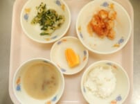 本日の給食は… *里芋と鶏肉のケチャップ和え 〈里芋・鶏もも肉・小麦粉・米粉・油・ケチャップ・しょうゆ・三温糖・みりん〉 *白菜の海苔和え 〈白菜・小松菜・焼きのり・しょうゆ・ごま油・ごま〉 *みそ汁 〈白みそ・煮干だし汁・ねぎ・なめこ・木綿豆腐〉 *オレンジ 本日のおやつは… ◆牛乳 ◆ホットドック 〈ロールパン・ウインナー・きゅうり・三温糖・塩・玉ねぎ・ケチャップ〉 本日のかみかみ期給食は… 〇鶏肉の甘辛和え 〈鶏もも肉・小麦粉・米粉・油・しょうゆ・三温糖〉 〇白菜の海苔和え 〈白菜・小松菜・焼きのり ...