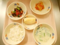 本日の給食は… *ソース焼きそば <焼きそばめん・豚もも肉・たまねぎ・にんじん・キャベツ・もやし・あおのり・ウスターソース・オイスターソース・しょうゆ・塩・油> *青のりポテト <じゃがいも・あおのり・塩・しょうゆ> *ごまみそスープ <鶏ひき肉・もやし・木綿豆腐・おろしにんにく・水・ごま油・牛乳・すりごま・白みそ・しょうゆ・中華だしの素> *バナナ 本日のおやつは… ◆牛乳 ◆ごはん磯部もち <米・バター・しょうゆ・焼きのり> 本日のごっくん期の離乳食は… 〇つぶしうどん 〇木綿豆腐 〇じゃがいも 〇キ ...