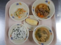 本日の給食は・・・ *わかめごはん 〈米・炊き込みわかめ〉 *肉じゃが 〈豚もも肉・じゃがいも・玉ねぎ・にんじん・いんげん・しらたき・かつおだし・しょうゆ・酒・みりん・三温糖〉 *白菜とちくわの和風サラダ 〈白菜・にんじん・ちくわ・コーン・かつお昆布だし汁・しょうゆ・三温糖・マヨドレ・ごま・ほんだし・かつお節〉 *みそ汁 〈煮干しだし汁・白みそ・大根・にら・油揚げ〉 *りんご 本日のおやつは・・・ ◆牛乳 ◆ベーコンマヨパン 〈強力粉・三温糖・ドライイースト・塩・バター・玉ねぎ・ベーコン・にんにく・塩・オ ...