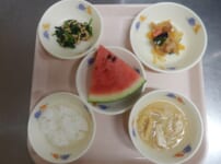 本日の給食は… *ごはん *甘辛つくね <鶏ひき肉・木綿豆腐・玉ねぎ・れんこん・おろししょうが・片栗粉・マヨドレ・酒・醤油・パン粉・みりん・醤油・三温糖・片栗粉> *ごま人参 <人参・油・すりごま・醤油・三温糖> *みそ汁(油揚げ・キャベツ・しめじ) *バナナ 本日のおやつは… ◆牛乳 ◆ナポリうどん <うどん・油・玉ねぎ・ピーマン・ウインナー・ケチャップ・ソース・牛乳・バター・粉チーズ> 本日のかみかみ期の離乳食は… 〇軟飯 〇甘辛つくね <鶏ひき肉・木綿豆腐・玉ねぎ・片栗粉・醤油・三温糖・片栗粉> 〇 ...