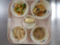 本日の給食は… *深川めし <米・あさり・油揚げ・酒・醤油・塩・みそ・みりん・三温糖> *鱈の野菜あんかけ <鱈・米粉・小麦粉・塩・赤ピーマン・黄ピーマン・小松菜・玉葱・水・ごま油・醤油・みりん・三温糖・酢・片栗粉・和風だし> *ブロッコリーのチーズおかか和え <ブロッコリー・人参・醤油・かつお節・チーズ> *みそ汁(なめこ・木綿豆腐) *りんご 本日のおやつは… ◆牛乳 ◆どら焼き <小麦粉・油・牛乳・三温糖・ベーキングパウダー・こしあん・生クリーム・グラニュー糖> 本日のごっくん期の離乳食は… 〇つぶ ...