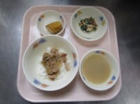 本日の給食は・・・ *鮭ごはん 〈ごはん・鮭・塩〉 *野菜の含め煮 〈豚肉・大根・人参・たけのこ・つきこんにゃく・生揚げ・油・醤油・三温糖・酒・みりん・塩〉 *ほうれん草のごま和え 〈ほうれん草・人参・ちくわ・ごま・醤油・三温糖〉 *みそ汁(わかめ・長ねぎ) *パイン缶 (※完了期食も同様です。) 本日のおやつは・・・ ◆牛乳 ◆手作りクラッカー 〈小麦粉・片栗粉・油・塩・青のり・粉チーズ・プロセスチーズ・トマト・人参〉 本日のゴックン期離乳食は・・・ 〇つぶし粥 〇しらす 〇大根 〇人参 ...